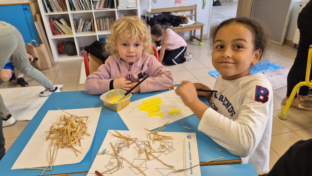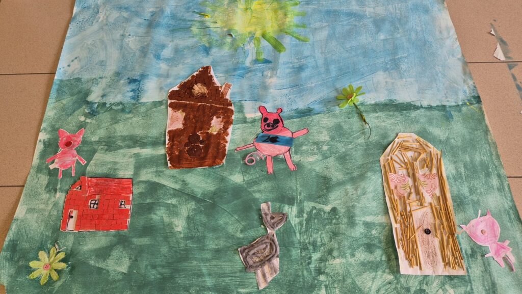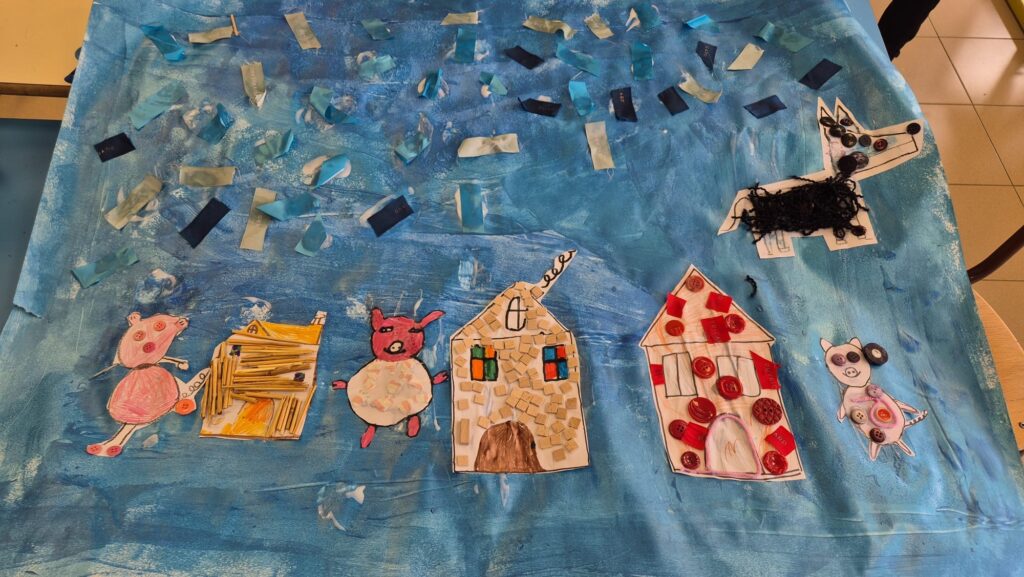 Les enfants ont découvert l’histoire des Trois Petits Cochons en kamishibai, un théâtre d’images japonais, et ont ensuite créé des illustrations inspirées de ce conte.