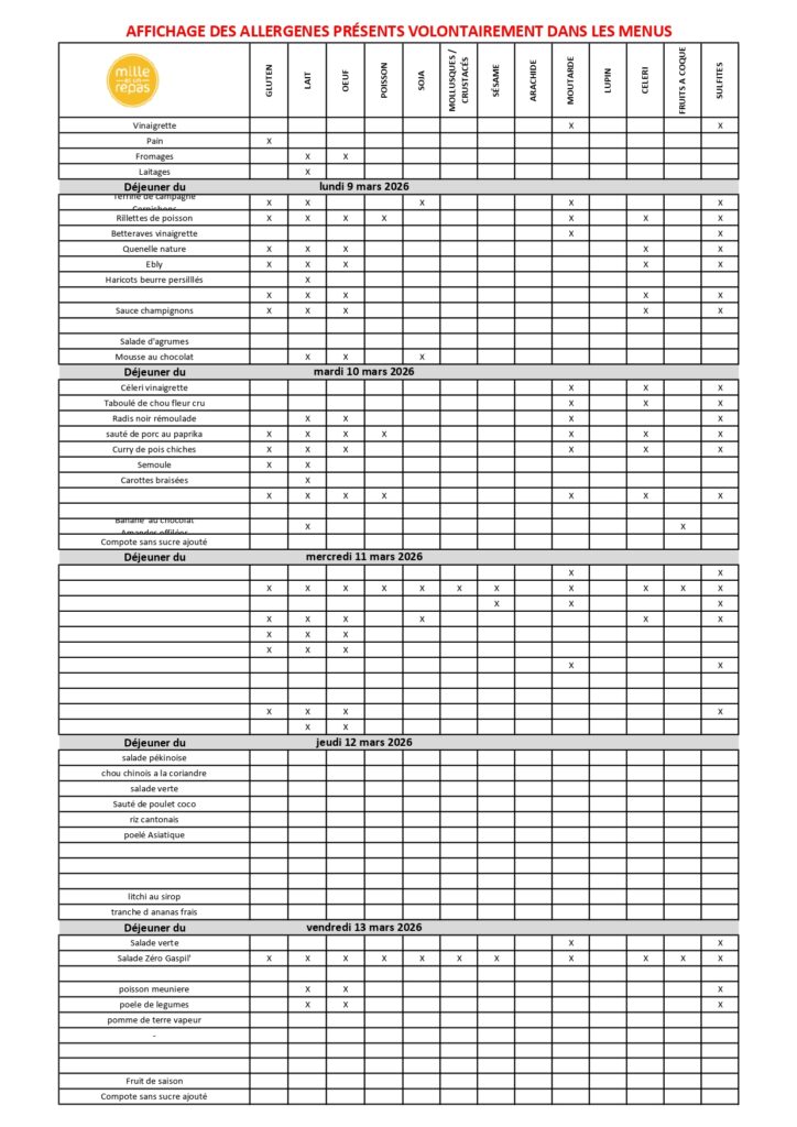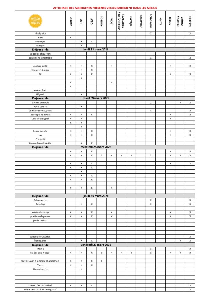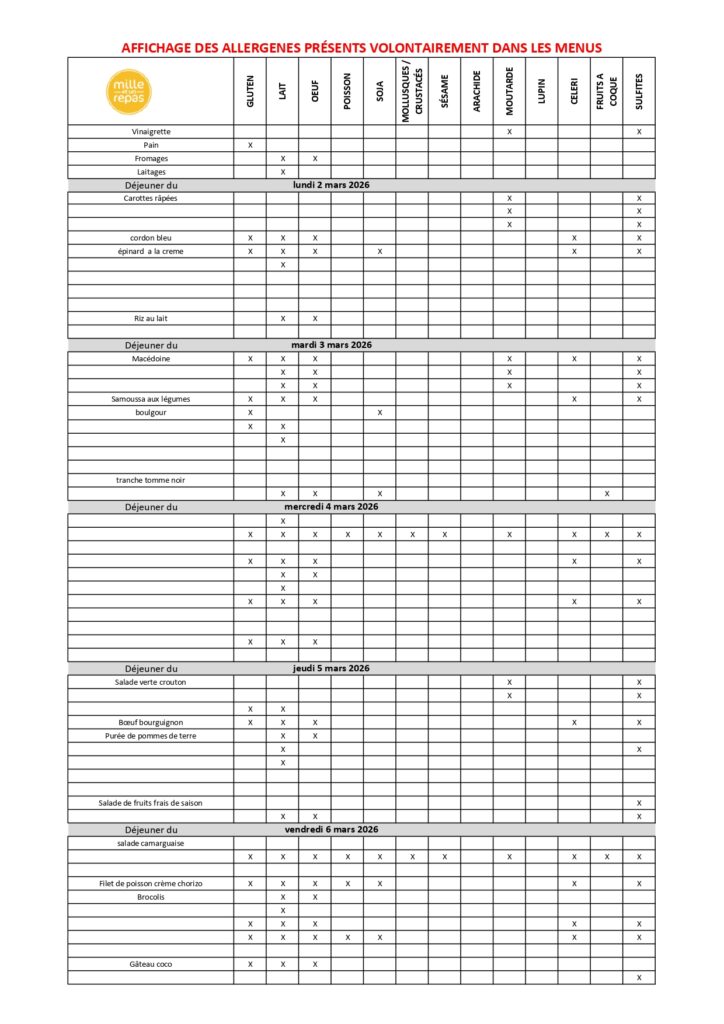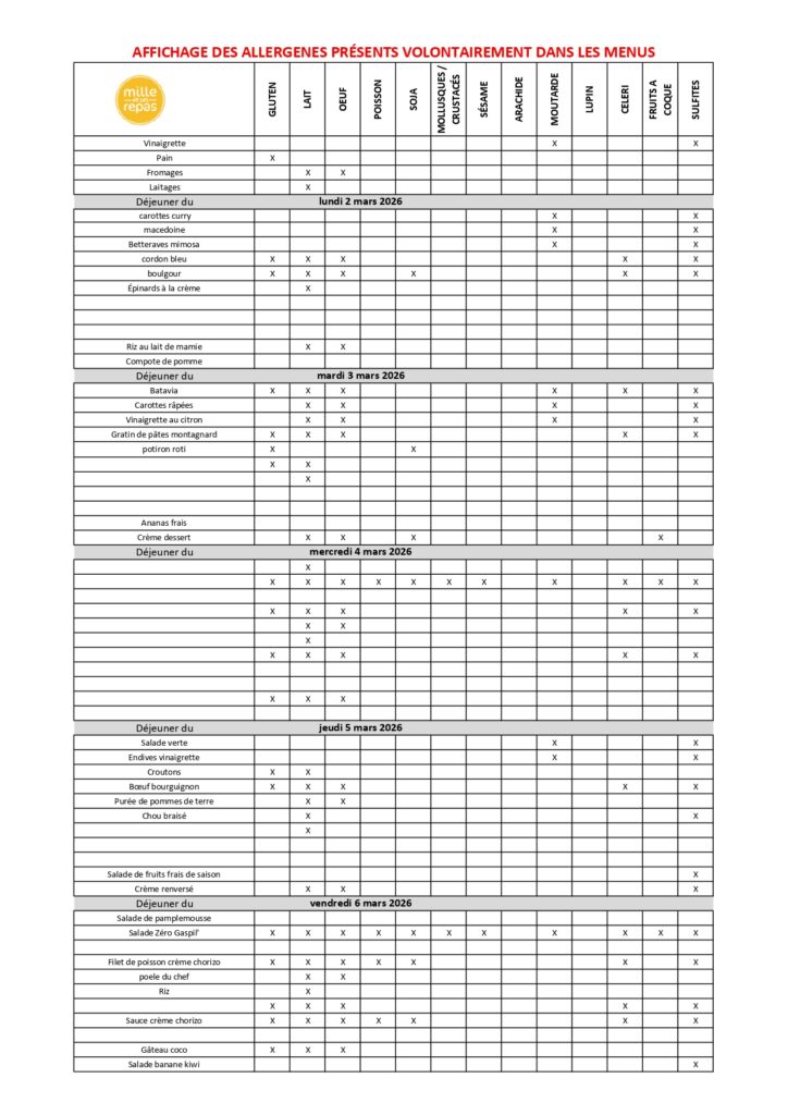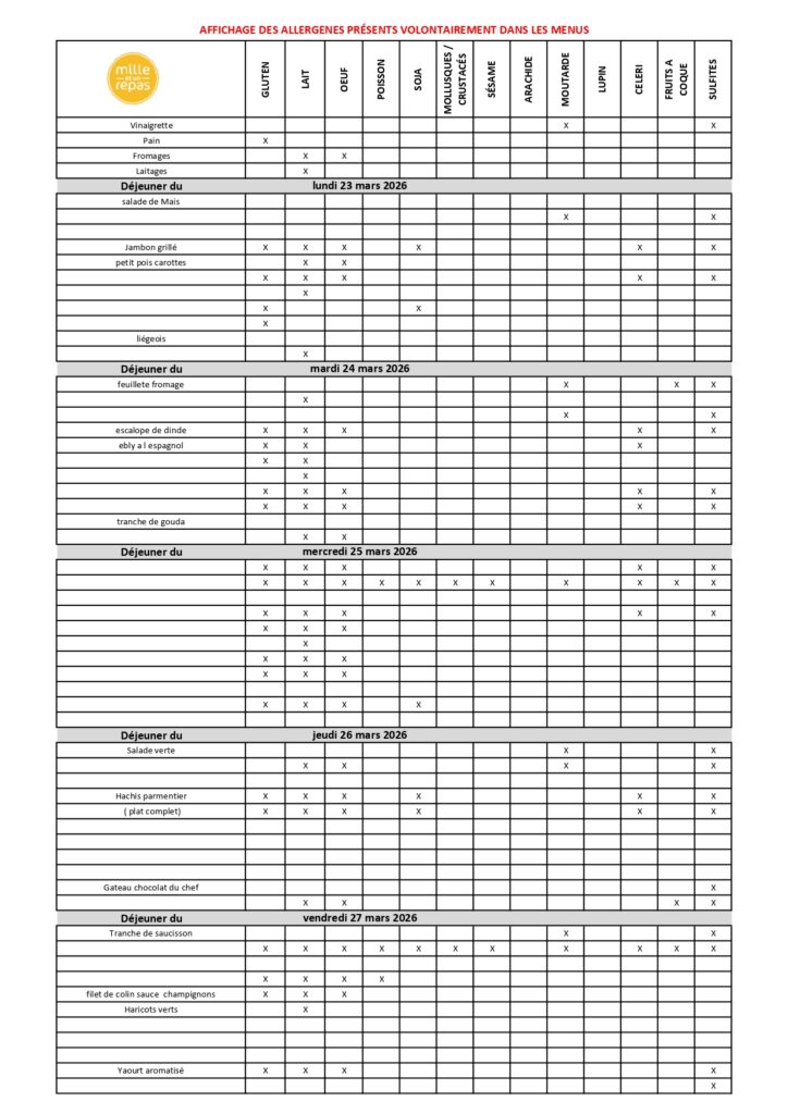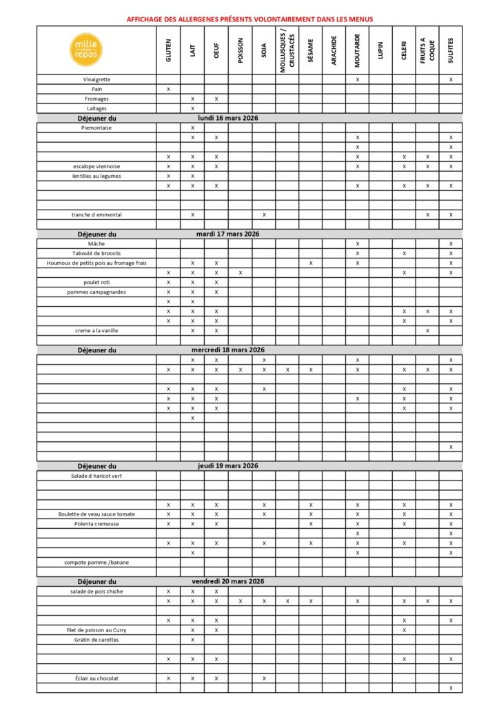 Menus du mois de mars 2026Par Jade Valette / 3 mars 2026 Pour l’école primaire et maternelle : Pour le collège : Les allergènes de l’école primaire et maternelle : Les allergènes du collège :
