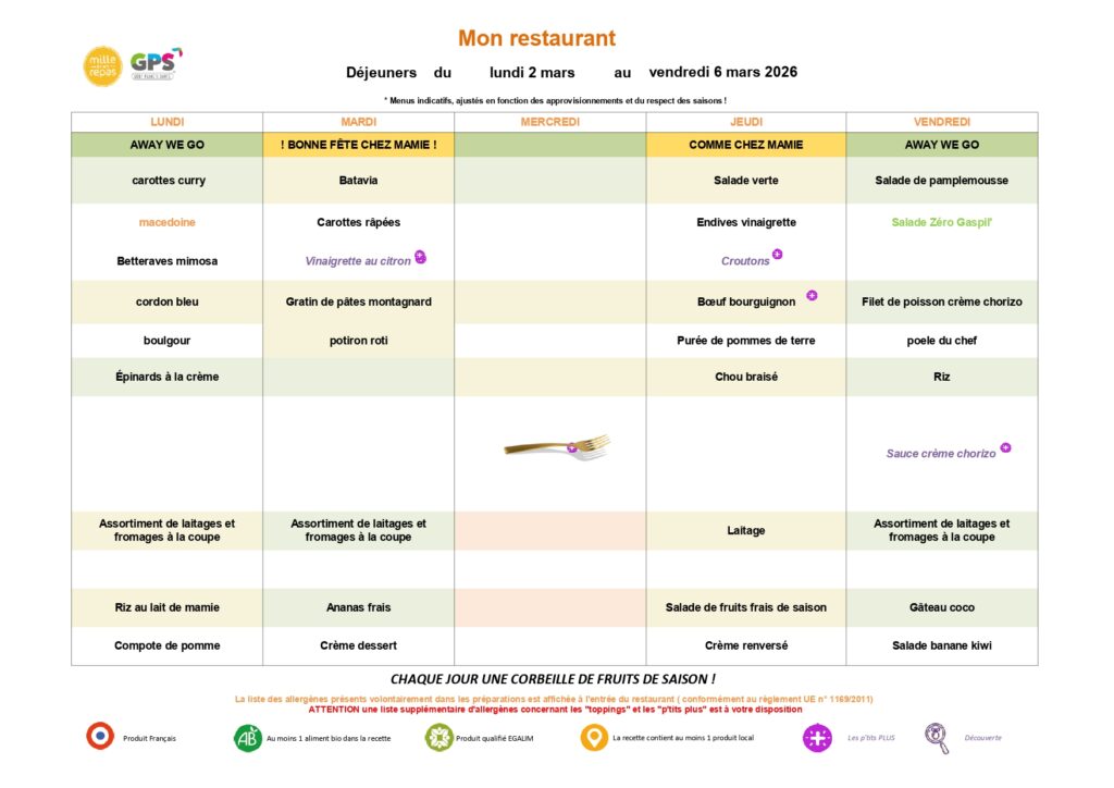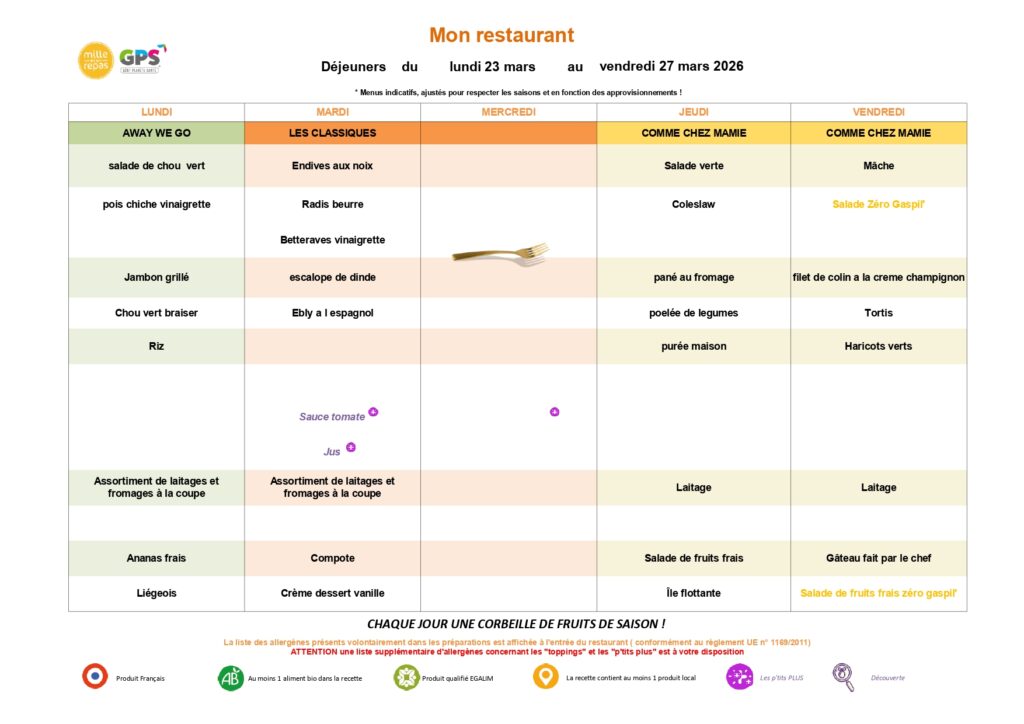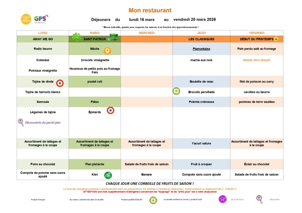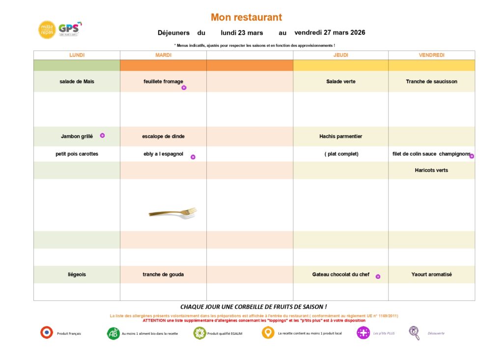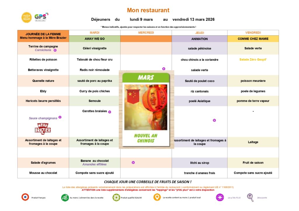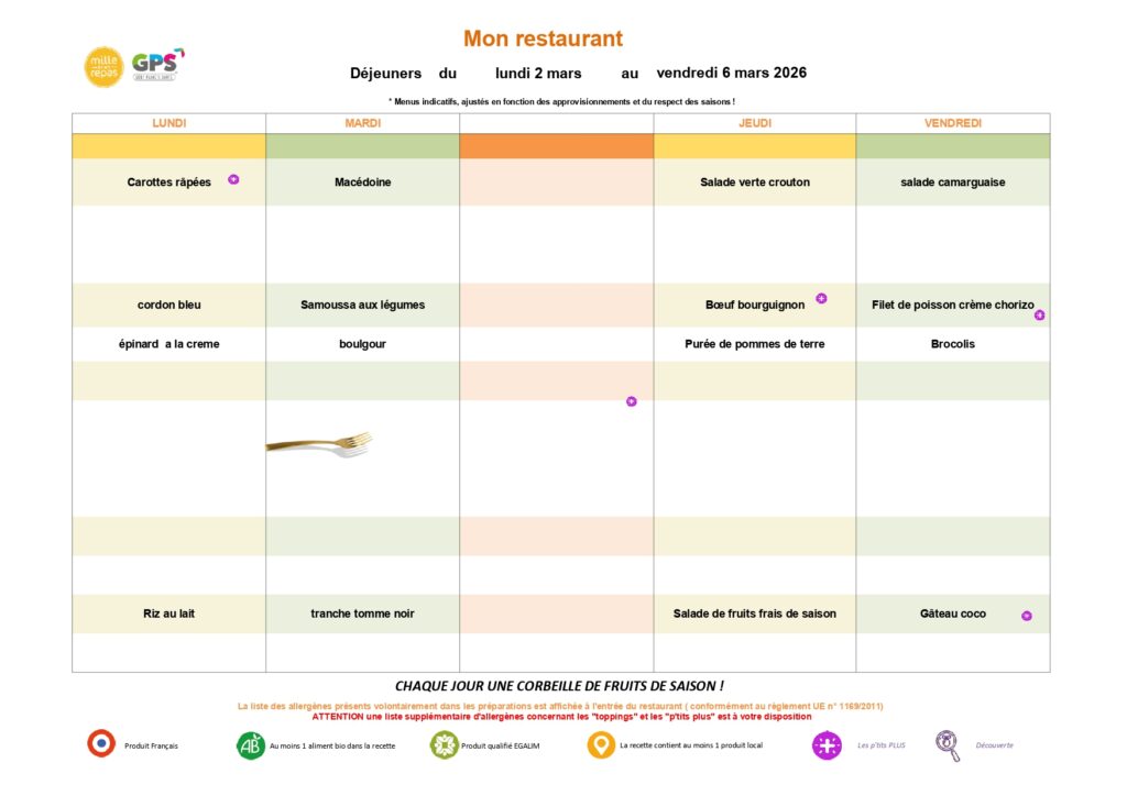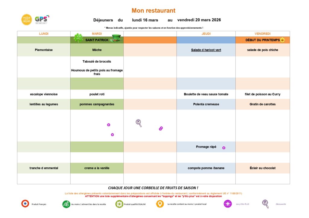 Menus du mois de mars 2026Par Jade Valette / 3 mars 2026 Pour l’école primaire et maternelle : Pour le collège : Les allergènes de l’école primaire et maternelle : Les allergènes du collège :